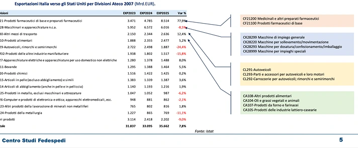 A livello di grandi aree di prodotto (divisioni Istat), il 94% dell’export italiano verso gli Stati Uniti è realizzato dalle quindici divisioni. Il 55% è dato dalle prime quattro: le aree dell’industria farmaceutica, della meccanica, dei mezzi di trasporto e dei prodotti alimentari (quarta voce nella tabella sottostante, ndr).