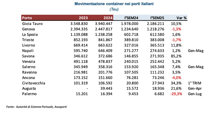 Non sono ancora disponibili i dati aggiornati di tutti i porti italiani, ma solo dei maggiori. Nei primi sei mesi del 2025 si registrano crescite significative a Livorno (+11,8%) e Gioia Tauro (+10,5%) e risultati negativi per Genova (-1,3%) e Trieste (-1,7%). La flessione di Trieste è in parte dovuta alla separazione dell’alleanza 2M (Maersk, Msc).