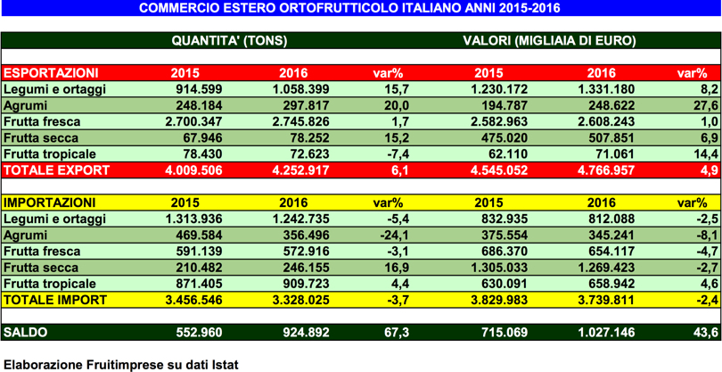 Cresce ancora l'export ortofrutticolo dell'Italia nel 2016 sia a valore che a volume. È quanto comunica Fruitimprese dopo l'analisi dei dati ufficiali e definitivi dell'Istat. A valore le nostre esportazioni sono cresciute del 4,9%, pari a 4 miliardi e 750 milioni di euro, così come a volume: 4 milioni e 250 mila tonnellate, pari a una crescita del 6,1%. Il saldo con l'import supera di poco il miliardo di euro con un incremento del 43,6% rispetto al 2015. In leggero calo, invece, le importazioni sia in volume (-3,7%) che in valore (-2,4%).