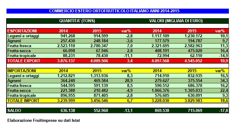 Superata la soglia dei 4,5 miliardi di euro a valore. È quanto comunica Fuitimprese dopo aver elaborato i dati ufficiali dell’Istat relativi al 2015. Le esportazioni di ortofrutta italiane hanno fatto segnare un incremento del 10,9% a valore. Positivo anche il dato riferito ai volumi che, con oltre 4 milioni di tonnellate, cresce del 3,4%.