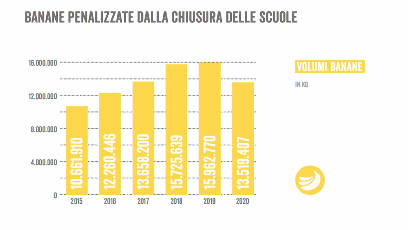 Le banane restano comunque il primo prodotto per volumi. Crescono costantemente da 15 anni, anche se la pandemia le ha fermate: il 2020 ha registrato una perdita del 15% rispetto all'anno precedente, il che significa 13.500 tonnellate di venduto: “Le perdite sono da imputare alla chiusura delle scuole e del fuori casa – ha argomentato il manager – Ma siamo ottimisti per l'anno in corso, le prime proiezioni sul 2021 fanno comunque già sperare a un ritorno ai valori pre-crisi“.