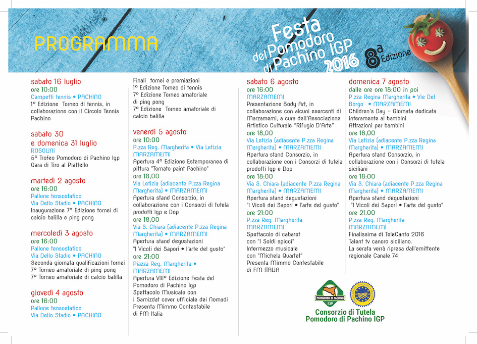Il programma della festa è stato poi illustrato da Maria Impera, segretaria del Consorzio e organizzatrice da otto anni dell’evento:”La Festa diventa sempre più un appuntamento per tutto il territorio. Alle attività di tipo artistico, sportivo e enogastronomico anche quest’anno si affiancherà la musica e lo spettacolo nelle serate di venerdì 5, sabato 6 e domenica 7 agosto”. La nutrizionista Stefania Arfò ha infine sottolineato le proprietà nutrizionali del Pomodoro di Pachino Igp.