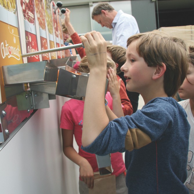 Automato – Stoffels, Belgio. Distributore automatico per il punto vendita: da tre contenitori cadono, direttamente nella borsa della spesa, diversi tipi di pomodori ciliegini.