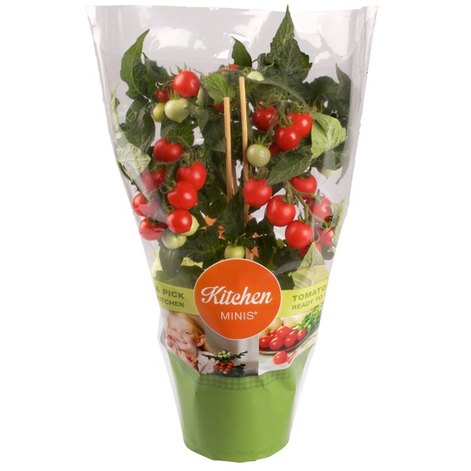 Kitchen Minis®-Tomato – Northern Greens, Danimarca. Una pianta di pomodori ciliegia per il davanzale della finestra di casa che produce fino a 150 frutti.