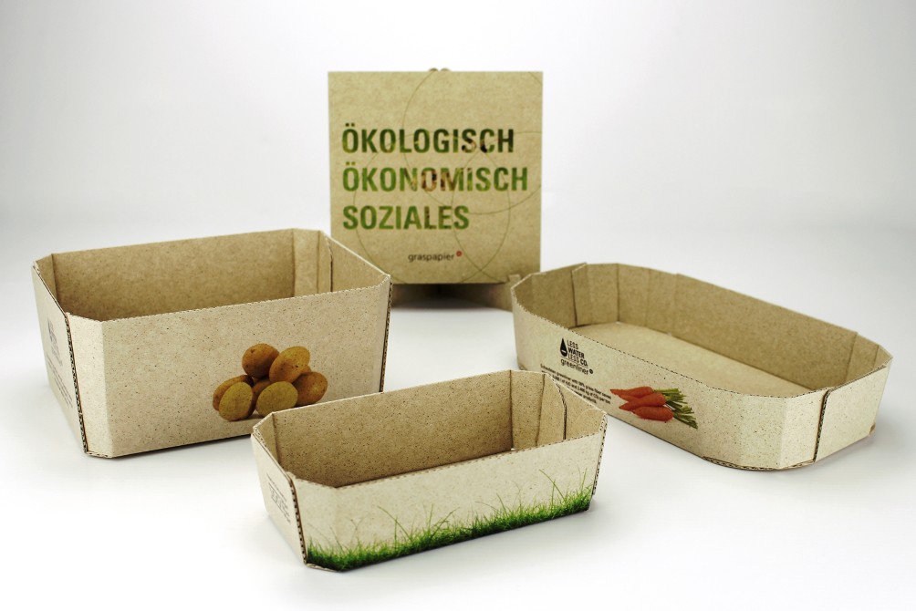 “Scheufelen Grass Paper – Greenliner“, Papierfabrik Scheufelen, Germania. Un materiale ecologico per l'imballaggio di frutta e verdura composto al 50% con fibre d’erba fresca e con altre materie prime che riducono in modo sostenibile il consumo di energia e acqua.