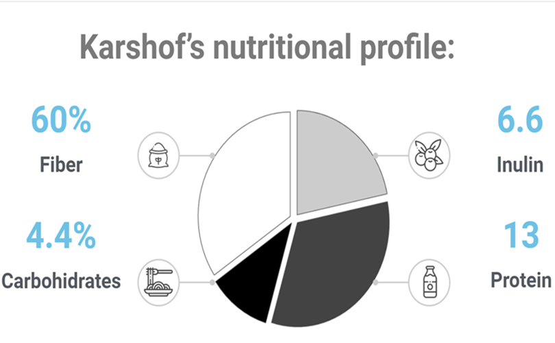 Il prodotto è Karshof, una farina funzionale ad alta digeribilità, priva di glutine, a basso contenuto di zuccheri ma ricca di fibre (60%), proteine (13%) inulina e cinarina.