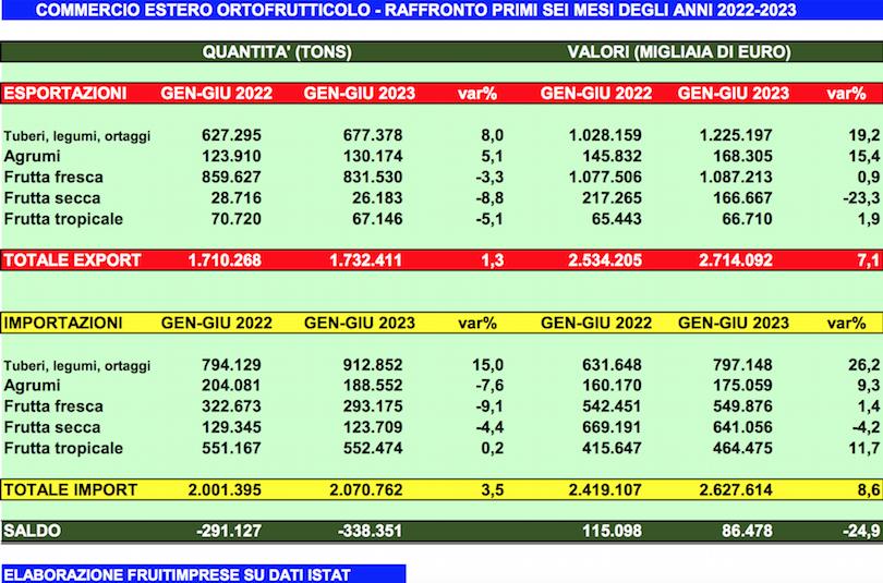 Inversione di tendenza per il saldo commerciale ortofrutticolo nel primo semestre 2023, che registra un segno meno rispetto allo stesso periodo del 2022 (-24,9%). Una brutta frenata dopo la crescita progressiva dei primi 5 mesi dell’anno che aveva fatto ben sperare. Male anche il saldo in volume che passa dalle -291.127 tonnellate dei primi sei mesi del 2022 alle -338.351 del primo semestre dell’anno in corso.