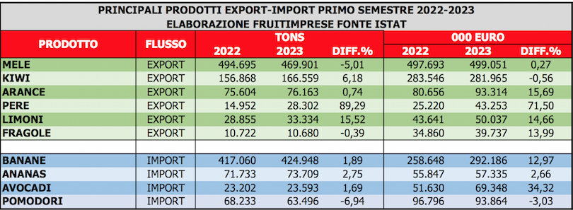 Per quanto riguarda le importazioni, a parte gli ortaggi, dei quali abbiamo già accennato, le quantità importate dei vari comparti segnano tutte segno negativo, recuperano in valore gli agrumi e la frutta tropicale, evidentemente per l’effetto dell’inflazione. Tirando le somme le importazioni nel settore ortofrutticolo crescono ancora +3,5% in volume e 8,6% in valore.