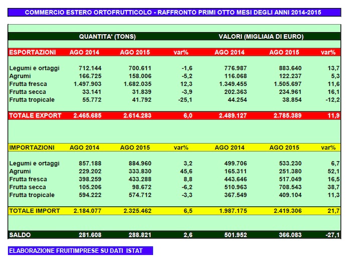 Dati import-export ortofrutta gennaio agosto 2015