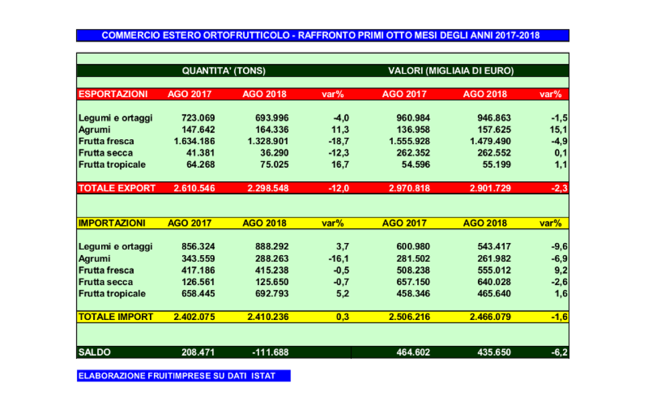 Dando uno sguardo agli altri generi ortofrutticoli, chi registra le performance migliori in termini di valore sono gli agrumi, il cui export cresce dell’11,7% in quantitativi e del 15,9% in fatturato. Calano invece le esportazioni di frutta fresca (- 18,8% in quantitativi e – 6,9% in valore), mentre quelle di frutta tropicale aumentano notevolmente in quantitativi (+ 18,2%) ma non in valore (solo + 2,2%). Sostanzialmente invariati legumi e ortaggi (- 2,9% in quantitativi e – 1% in fatturato). Per quanto concerne le importazioni, la frutta fresca rimane stabile nei quantitativi (- 0,6%) ma costa di più (+ 8,2%); legumi e ortaggi aumentano nei quantitativi (+ 2,1%) ma calano in valore ( – 9,1%); gli agrumi diminuiscono nei quantitativi ( – 15,8%) e nel valore ( – 6,8%); la frutta tropicale è sostanzialmente stabile (+ 2,3% in quantitativi e + 1,5% in valore). import export gennaio settembre 2018