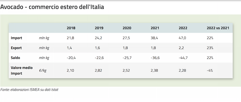 Il successo dell’avocado sul mercato italiano è testimoniato dall’incremento a tripla cifra delle importazioni degli ultimi cinque anni. Dai circa 20 milioni di chilogrammi (al netto delle quantità riesportate) del 2018, si è infatti passati ai circa 45 milioni del 2022 (+120%).
