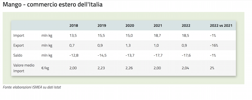 Uno scenario simile a quello dell’avocado, sebbene con numeri inferiori e alcune dinamiche diverse, è quello delineato per il mango: l’Italia evidenzia un crescente interesse verso questo prodotto, tanto che si è passati dai 13,5 milioni di chili importati nel 2018 ai 18,5 milioni del 2022 (+37%). Nei primi cinque mesi del 2023, però, le importazioni di mango si sono ridotte del 10% rispetto al 2022, confermando il rallentamento registrato nel 2022, -1% rispetto al 2021.