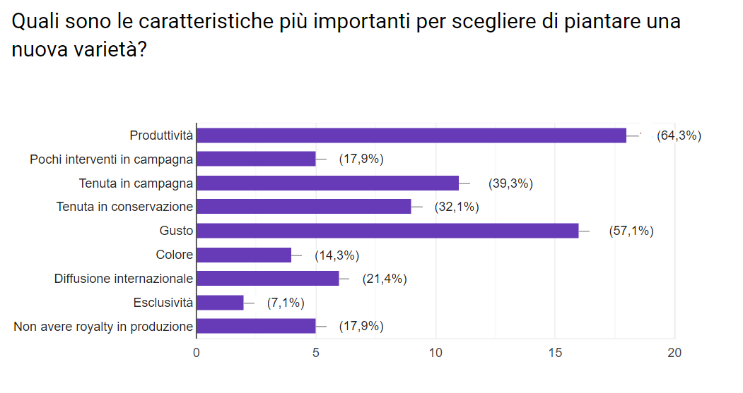 Mentre non stupisce che tra i primi criteri in base al quale si decidono le varietà da piantare i partecipanti abbiano citato la produttività per ettaro e le caratteristiche di conservabilità (sia in campagna che in frigorifero), è confortante che il 57% delle risposte abbia citato il gusto, elemento fondamentale per soddisfare i consumatori e differenziarsi dalla concorrenza.
