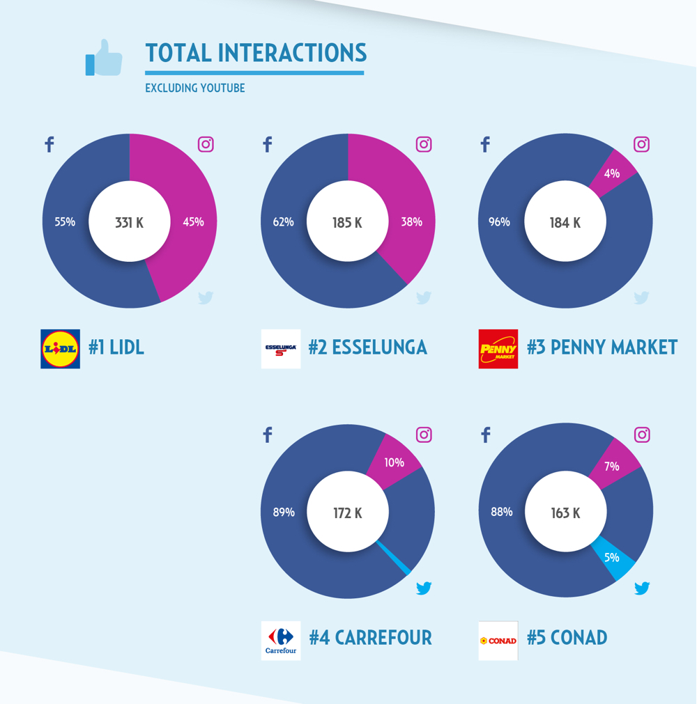 Lidl, il player tedesco del mondo discount e presente in Italia dal 1992, ha la comunicazione più coinvolgente su Facebook, Instagram e Twitter con un engagement “pari a 331 mila interazioni e oltre 82 mila nuovi fan, nel periodo analizzato”. Lidl si aggiudica anche il premio di most commented post, grazie al post del 29 dicembre 2018 che ritrae un tira-graffi in vendita e che ha totalizzato più di 6000 commenti. Tra i top 5 di questa classifica troviamo anche Esselunga, Penny Market (Gruppo Rewe), Carrefour e Conad.