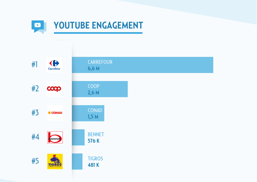 Per quanto riguarda Youtube, invece, spicca l'insegna francese Carrefour, che “si guadagna anche il premio per il most viewed content del periodo, con un video che ottiene oltre 1,8 milioni di visualizzazioni!”. A seguire Coop, Conad, Bennet e Tigros. Una menzione speciale anche per Eurospin “che con il suo video-post dedicato alle promozione natalizie si guadagna il titolo di most reacted post della nostra Top Brands”.