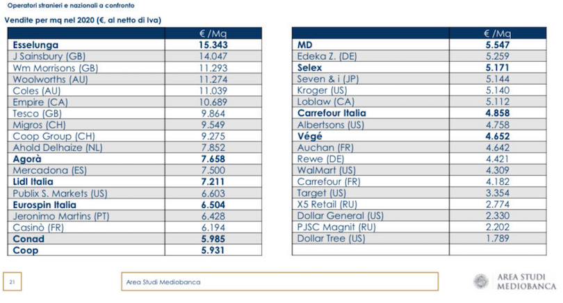 Rilevante anche la differenza con Conad e Coop: entrambe non arrivano a 6mila euro al metro quadrato.