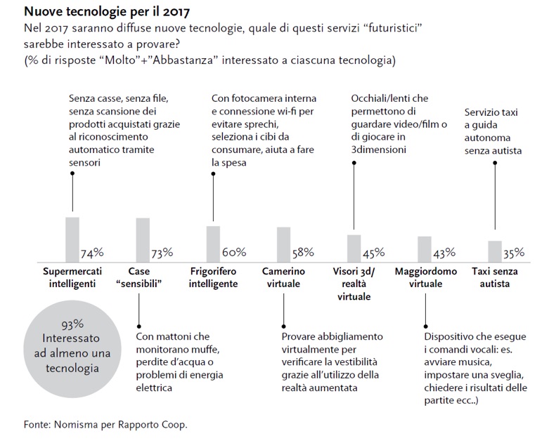 Nonostante questo la voglia di sperimentare e innovare c'è: “il 93% dei campione intervistato nel sondaggio si dichiara incuriosito da nuovi prodotti e servizi. Quali? Per esempio vorrebbe un supermercato senza casse e quindi senza file (74%), una casa domotica (73%) o addirittura il maggiordomo virtuale (lo testerebbe il 43%).