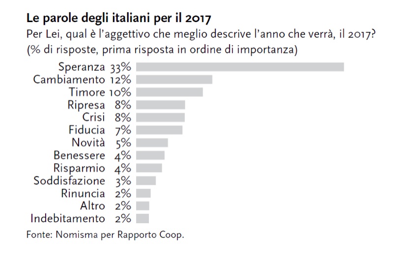 La fotografia dell'Italia che emerge dal sondaggio mostra “un paese che sta alla finestra e che, passati gli anni bui della recessione, spera nel futuro ma stenta a metterne a fuoco i dettagli” commenta nella nota l’Ufficio Studi di Ancc-Coop (Associazione Nazionale Cooperative di Consumatori). Le parole, infatti, con le quali gli italiani descrivono l'anno appena iniziato sono speranza (33%), cambiamento (12%) e timore (10%). Un terzetto di aggettivi che già avevano caratterizzato i sentimenti degli italiani l'anno scorso nello stesso sondaggio “a dimostrazione di una condizione di stallo che accomuna Italia e italiani” sostiene Coop.