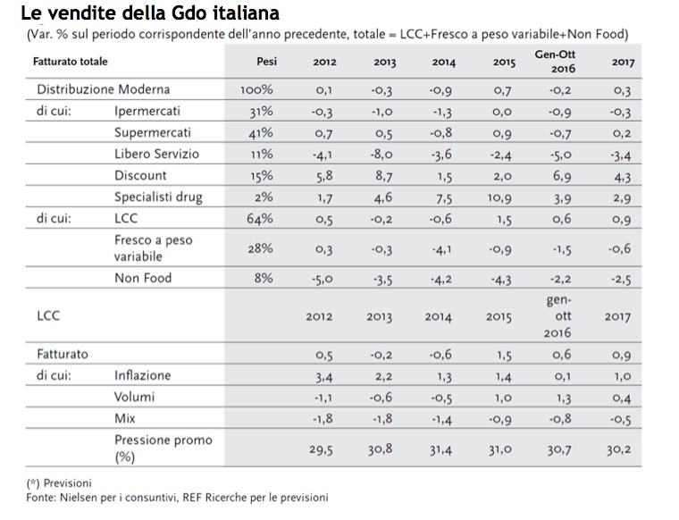 Infine, la grande distribuzione, il principale canale di acquisto da parte degli italiani. Il 2016 si chiude in perfetta parità rispetto al 2015, “beneficiando comunque di un piccolo miglioramento delle vendite registrato nelle ultime due settimane del 2016 e comunque non tale da non superare un +2% concentrato peraltro fortemente concentrato nei giorni pre-natalizi”. Il 2017? Secondo le previsioni di REF Ricerche, la distribuzione moderna crescerà dello 0,3% con il canale discount che dovrebbe continuare a performare meglio degli altri.