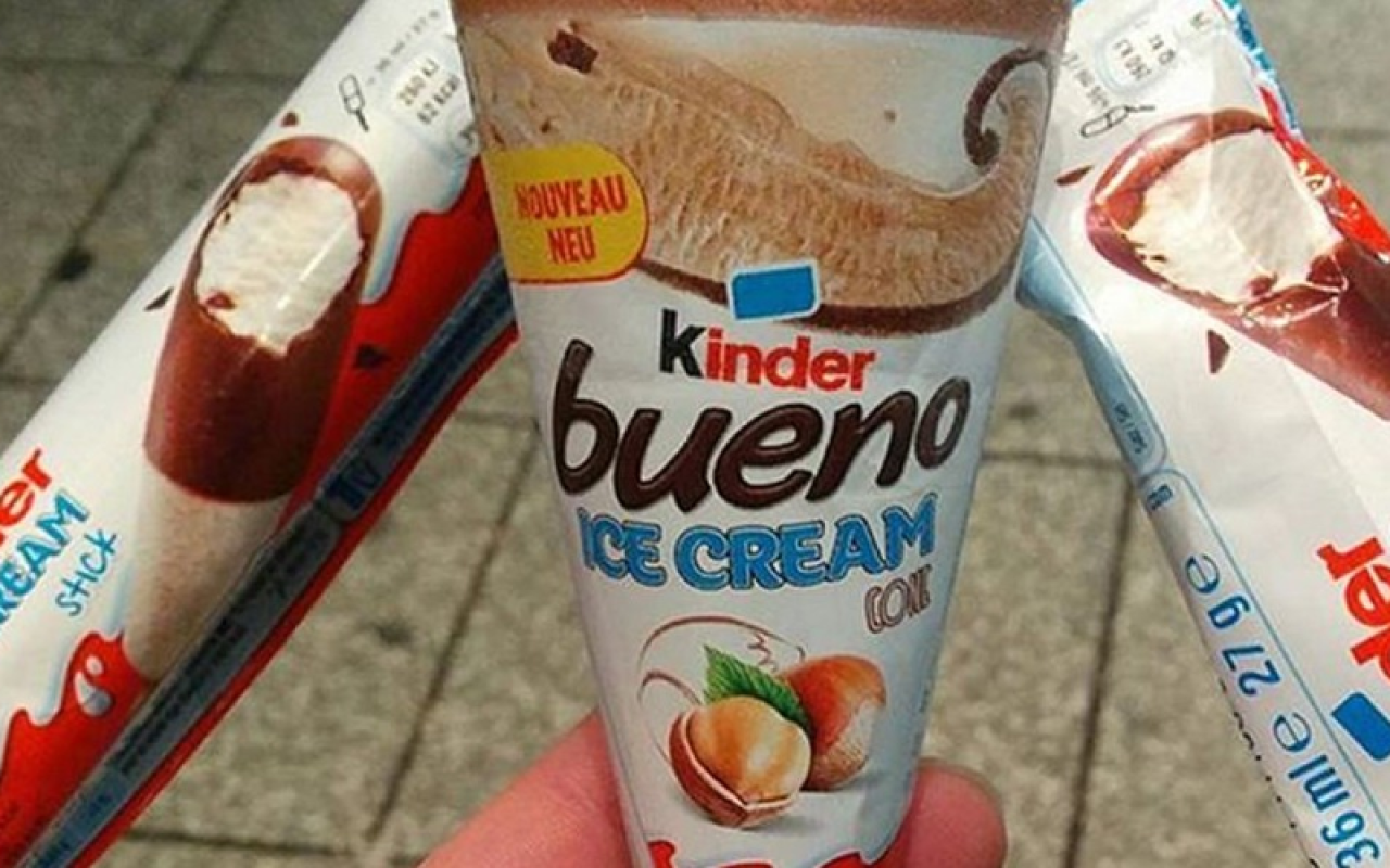 Si tratterà di tre diversi prodotti, il Kinder Bueno Cone, un cono che mette insieme il gelato con il gusto classico dello snack della Ferrero, lo Stick che è un gelato a stecco composto da una base di crema al latte ricoperta da una glassa al cioccolato al latte Kinder, e il Sandwich, un classico biscotto gelato con una crema al latte intero inserita tra due biscotti ai cinque cereali.