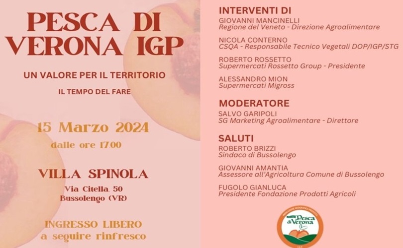 Continuano le azioni di promozione della pesca di Verona Igp. Il 15 marzo 2024 alle 17 appuntamento a Bussolengo, in provincia di Verona e più precisamente a Villa Spinola in via Citella 50, per il convegno: “Pesca di Verona Igp. Un valore per il territorio, il tempo del fare“.