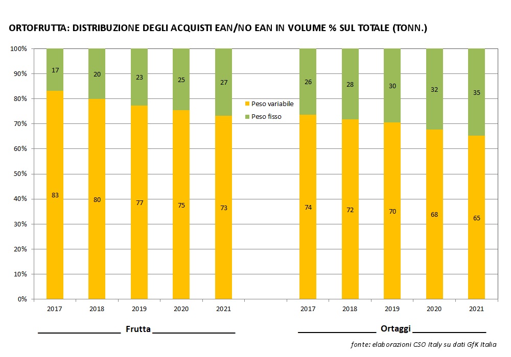 Secondo l’Osservatorio Cso Italy, l'acquisto medio di ciascuna famiglia italiana è stato di circa 229 chili, ovvero di quasi 7 chili in meno rispetto ai 12 mesi precedenti. Anche in termini pro-capite l’annualità chiude confermando il calo dei consumi, passati da 102 a 100 chili. In particolare per la frutta si parla di 51 chili di frutta mentre per gli ortaggi di 48 chili.