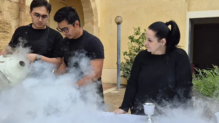 Accanto alle bolle, grande curiosità anche per il gelato istantaneo al limone di Siracusa Igp ghiacciato con azoto liquido, realizzato con il succo di verdello e menta crio macinata. La preparazione ha unito ricerca scientifica e piacere sensoriale, trasformando un classico della tradizione in un’esperienza futuristica e spettacolare.