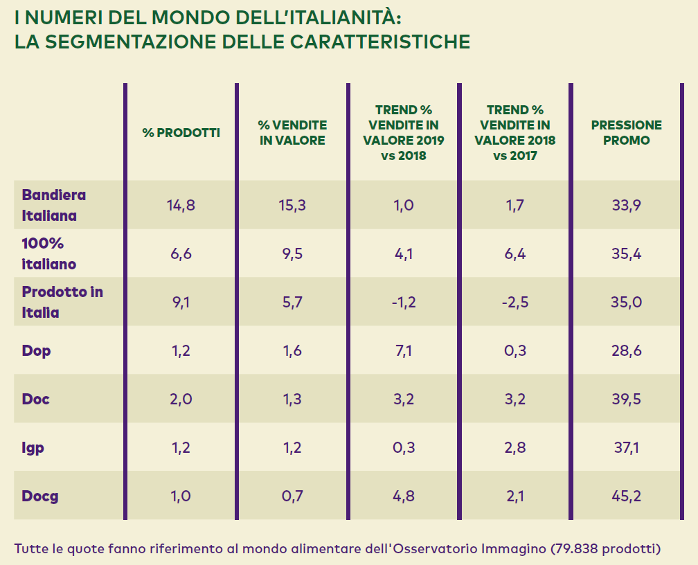 Il richiamo in etichetta delle regioni italiane è arrivato a rappresentare il 10,8% del paniere food dell’Osservatorio Immagino, per un giro d’affari superiore a 2,4 miliardi di euro (+2,6% sul 2018), sostenuto principalmente da un aumento dell’offerta (+4,4%).Ad aver contribuito al dinamismo dell’italianità in etichetta la fama che il made in Italy ha saputo costruirsi nei decenni e che rimanda alla promessa di un’esperienza organolettica di qualità. A ciò si aggiunge l’estensione a latte, formaggi, riso, pasta di grano duro e conserve di pomodoro dell’obbligo di indicare in etichetta il luogo in cui è avvenuta l'ultima trasformazione sostanziale e la coltivazione o l’allevamento della materia prima agricola prevalente.
