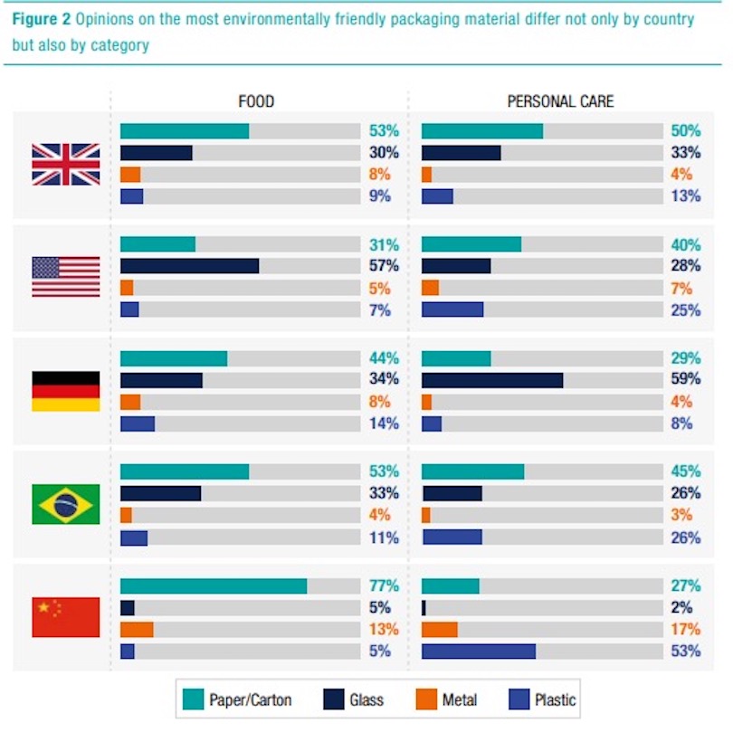 Negli Stati Uniti la percezione di sostenibilità suona diversamente. Secondo gli americani i contenitori in vetro sembrano più sostenibili (57%) rispetto alla carta e cartone (31%). Andando a vedere i pochi dati disponibili per il mercato americano, l'American Forest and Products Association indica il riciclo di carta e cartone negli Usa pari al 66%, mentre quello del vetro risulta di poco superiore al 31% (dato EPA 2018).