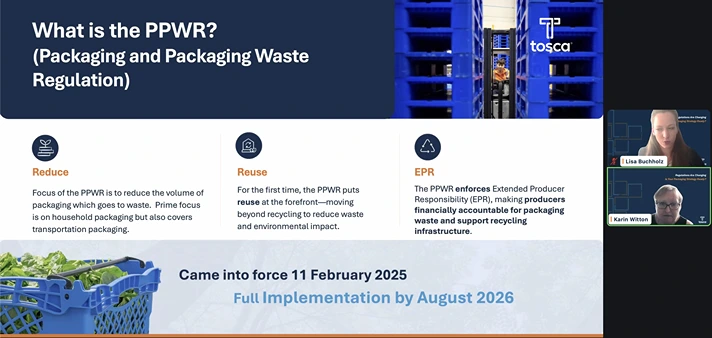 Il nuovo regolamento europeo sui materiali e i rifiuti di imballaggio (Ppwr, Packaging and packaging waste regulation), il quadro normativo sulla responsabilità estesa del produttore (Epr, Extended producer responsibility) e i potenziali impatto sul settore del packaging e su tutta la supply chain sono stati al centro del webinar Regulations are changing – Is your packaging strategy ready? che si è tenuto oggi pomeriggio, 17 giugno, e organizzato da Tosca, player globale nelle soluzioni di imballaggi in plastica riutilizzabili e riciclabili al 100% e nei servizi di pooling.