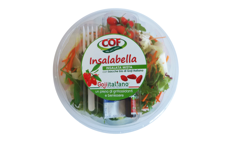 Nasce così “Insalabella”, questo il nome scelto per questa insalata che viene proposta in una ciotola da 165 g contenente indivia riccia e liscia, pan di zucchero, radicchio rosso, carote, rucola, bacche di Goji Italiano fresche e biologiche, e poi la forchettina e i condimenti (sale in bustina ed olio extravergine di oliva in monodose).