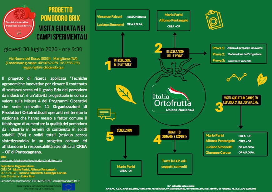 Italia ortofrutta unione nazionale e il Crea (Crea-Of), responsabile scientifico della ricerca, stanno organizzando, una visita guidata presso i campi sperimentali allestiti dal Crea e dai tecnici dell’organizzazione dei Produttori (Op) A.P.O.PA nell’ambito del progetto di ricerca applicata “Tecniche agronomiche innovative per elevare il contenuto di sostanza secca e il grado brix nel pomodoro da industria” con la finalità di illustrare e divulgare il progetto di ricerca in atto e le diverse prove sperimentali a beneficio delle aziende ortofrutticole operanti nel comparto del pomodoro da industria ed a tutti i soggetti interessati.