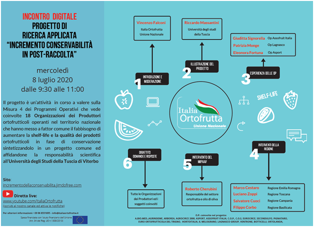 L’incontro, introdotto e moderato da Vincenzo Falconi, direttore di Italia Ortofrutta unione nazionale ha la finalità di condividere e disseminare le attività progettuali in corso di realizzazione con tutte le Op ed i produttori potenzialmente interessati alla tematica di allungamento della shelf-life ma anche con le amministrazioni pubbliche coinvolte nella gestione dell’Ocm come l’Agea, il Sin e le regioni. A tal fine l’iniziativa è stata trasmessa in diretta streaming sul canale YouTube di Italia Ortofrutta ed è disponibile per essere rivisto da tutti gli interessati al seguente collegamento: incontro digitale