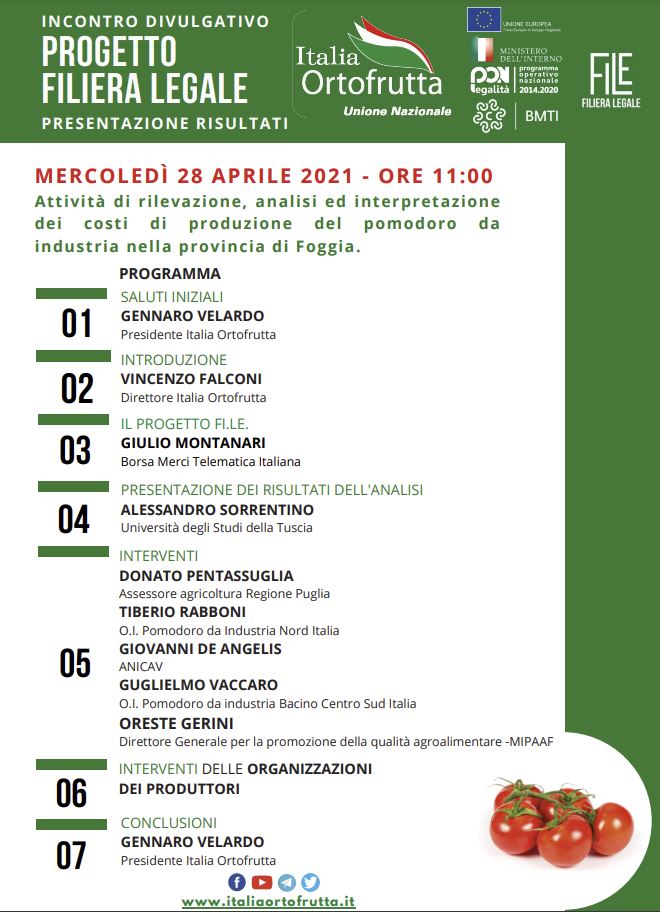 Mercoledì 28 aprile alle ore 11.00 Italia Ortofrutta unione nazionale presenterà i risultati dell'attività di rilevazione dei costi di produzione del pomodoro da industria nella provincia di Foggia.