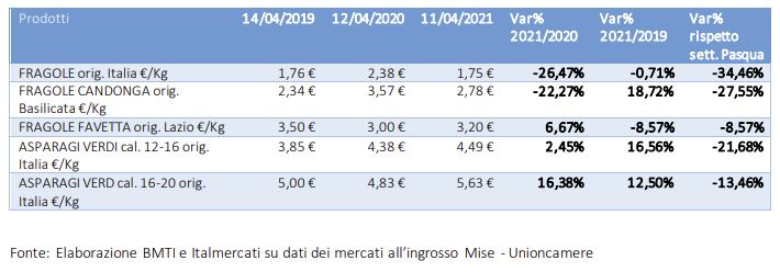 Nonostante il maltempo che negli ultimi giorni si è abbattuto sulla nostra penisola, la campagna delle fragole e degli asparagi sta proseguendo regolarmente ed è nel pieno della produzione. Come risulta dalle elaborazioni di Bmti sui dati rilevati nei mercati all'ingrosso appartenenti alla Rete di imprese Italmercati, infatti, per entrambi i prodotti si registra una consistente disponibilità e una buona qualità del prodotto. Tuttavia, il calo del livello della domanda registrato nelle settimane dopo la Pasqua, ha determinato un forte ribasso nei prezzi all'ingrosso ma un ottimo rapporto qualità/prezzo per entrambi i prodotti.