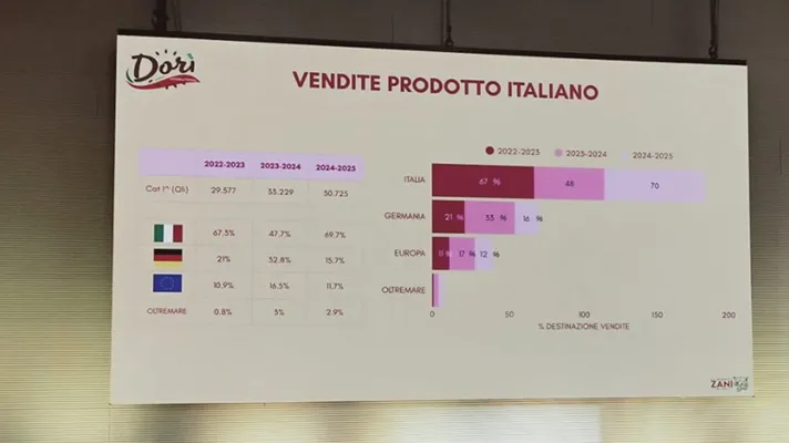 Antonio Zani di Granfrutta Zani ha illustrato, armato di grafici, il mercato di Dorì. Per quanto riguarda il prodotto italiano il mercato di riferimento "è la Gdo Italia, ma siamo presenti anche in Europa, la seconda destinazione è la Germania, e anche anche Oltremare".