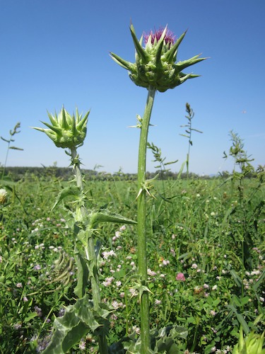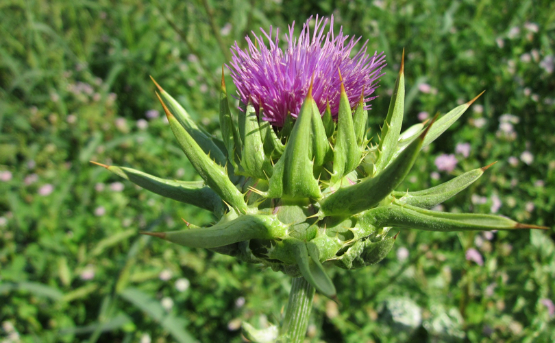 Il cardo mariano, il cui nome botanico è Silybum marianum, è una pianta erbacea che cresce spontanea in tutta la macchia mediterranea, principalmente al centro e sud Italia. Si rinviene con una certa facilità nei campi incolti, nei pascoli, lungo i margini dei sentieri, tra le macerie dove forma estesi gruppi. La pianta, che appartiene alla famiglia delle Asteracee, è costituita da una rosa di foglie spinose. I fiori, che raggiungono la maturità in estate, sono di colore rosso-purpureo, mentre i frutti sono oblunghi di colore nero brillante macchiati di giallo. Il cardo mariano non è oggetto di massiccia coltivazione. Nelle poche aree in cui il cardo viene coltivato, i semi vengono raccolti e sottoposti a un’azione meccanica di scuotimento per favorire la distribuzione e la crescita di nuove piante. Le foglie sono grandi, lobate, hanno un colore verde intenso, lucenti, con striature biancastre e bordo spinoso.