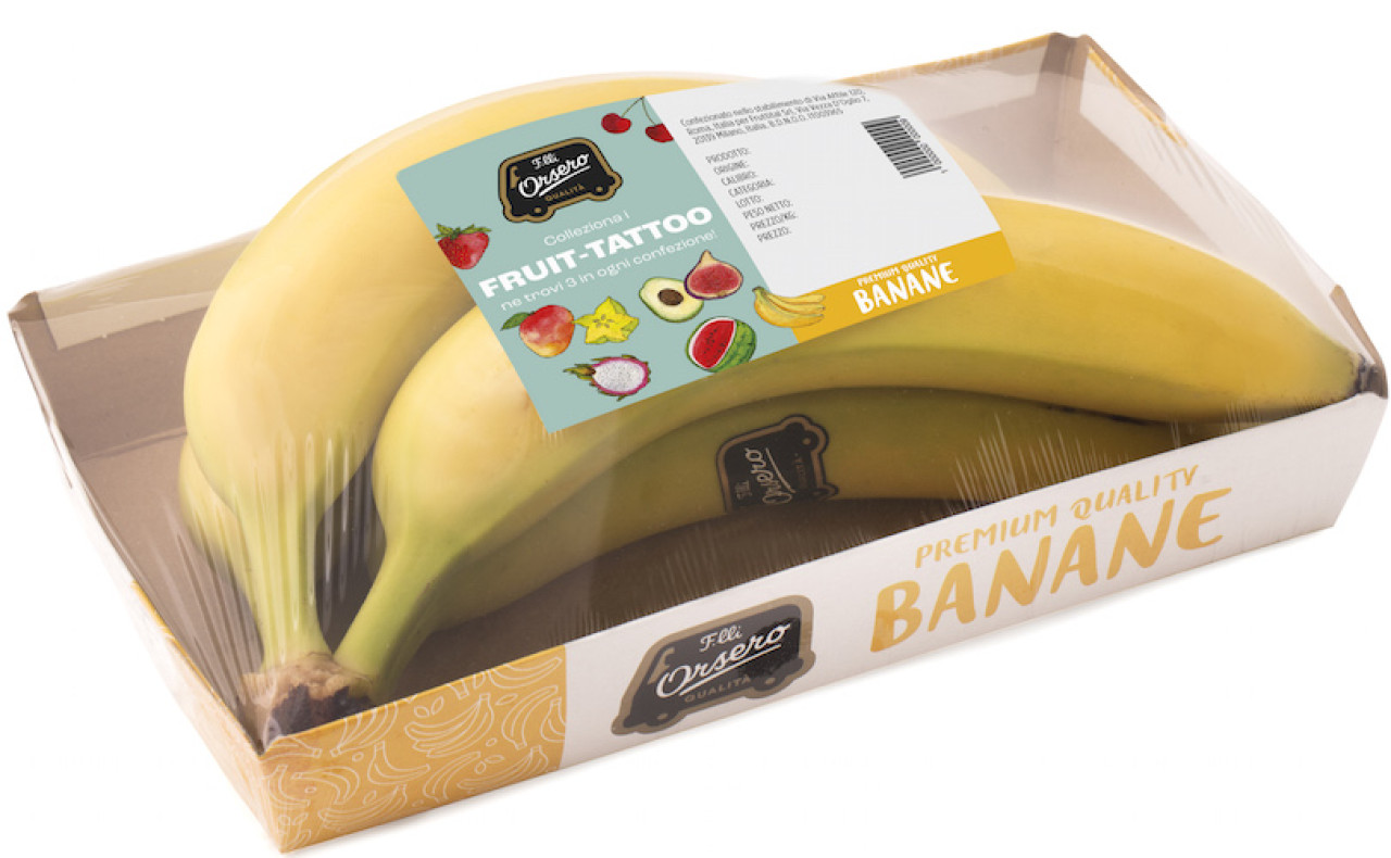 La confezione speciale, con vassoio di carta stampato con colori vegetali, contiene tanti simpatici fruit-tattoo, che renderanno divertente tornare a scuola. I tatuaggi temporanei F.lli Orsero sono creati in nove soggetti diversi, tutti da collezionare: banane, ciliegie, mango, avocado, fico, anguria, fragola, pitaya e carambola.