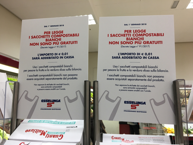 Nel nostro giro nei punti vendita di 10 insegne della grande distribuzione tra Milano e provincia (vedi qui) nei giorni successivi l'entrata in vigore della legge che obbliga i supermercati a mettere in vendita nei reparti ortofrutta gli ormai famigerati sacchetti biodegradabili e compostabili, l'avevamo notato anche noi: solo Esselunga comunica alla propria clientela che le etichette con il prezzo della merce da attaccare classicamente ai sacchetti dopo aver pesato la merce sono anch'esse compostabili.
