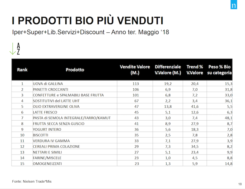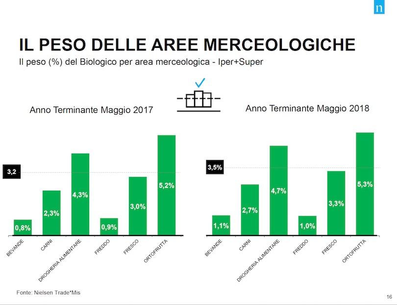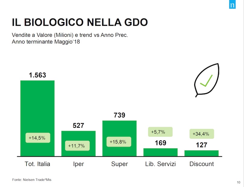 Prendendo in considerazione l'anno terminante a maggio 2018, il biologico in Gdo fa comunque segnare risultati di tutto rispetto: +14,5% in totale, per un giro di affari superiore al miliardo e mezzo di euro e con segnali molto positivi che arrivano anche da canali come le superette o i discount, i quali orami hanno stabilmente inserito il biologico all'interno dei loro assortimenti