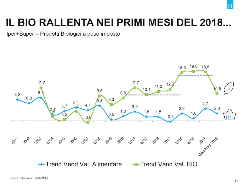 L'andamento lento della spesa alimentare, soprattutto a gennaio e febbraio, ha fatto sentire i suoi effetti anche all'interno di un comparto che viaggia a vele spiegate come il biologico: “solo” +10,5%, un dato che comunque appare non solo molto positivo in termini assoluti, ma anche in riferimento alla crescita del comparto alimentare che invece fa segnare un +2,8% in questi primi 5 mesi del 2018.