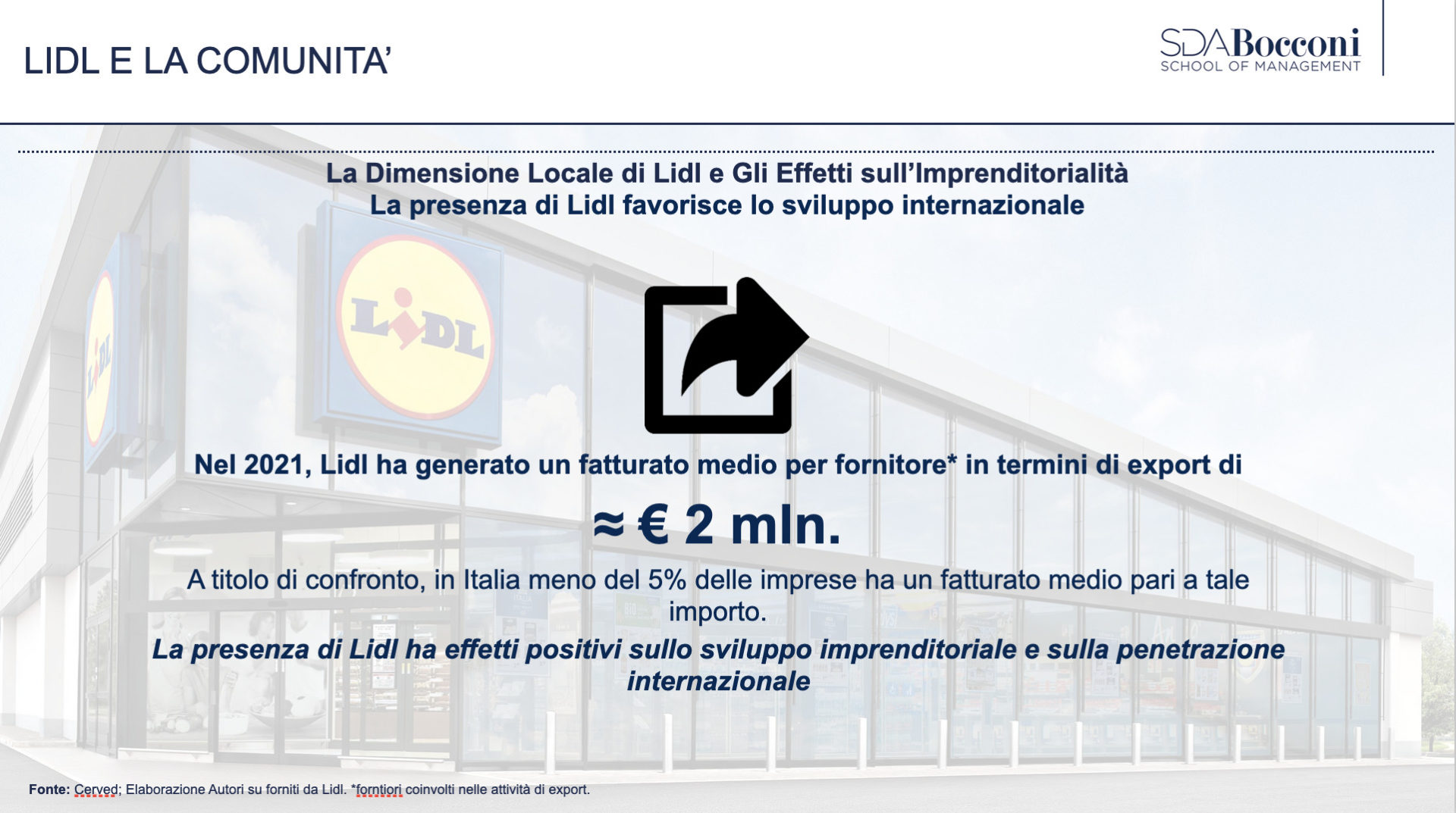Anche sul fronte dell’export le ricadute sulla filiera agroalimentare italiana sono importanti: Lidl ha esportato nel 2021 prodotti italiani all’interno dei suoi store nel mondo – potenzialmente 11.900 in 31 Paesi – per un valore di 2 miliardi di euro e ha generato un fatturato medio in termini di export di 2 milioni di euro per ogni fornitore.