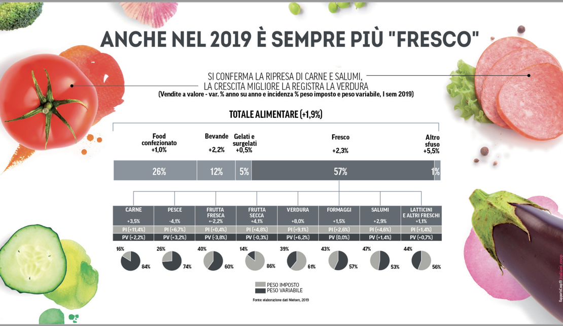 C'è un fattore da evidenziare all'interno di questo scenario e che emerge sempre dal Rapporto Coop. L'incidenza della crescita del peso imposto su quello variabile nelle varie categorie che compongono il fresco, decisamente preponderante: ad esempio, carne +11%, verdura +9,1%, frutta fresca +0,4% (mentre -3,8% il peso variabile). Secondo il Rapporto questo fa emergere chiaramente “l’importanza che l’aumento nelle vendite di prodotti confezionati ha avuto per il risultato complessivo di carne e verdura” e sostanzialmente per tutta quest'area. A proposito sempre di confezionato, l'area del fresco si interseca con quella del ready-to-eat, altra tendenza in grande crescita (+9.3% nei primi 6 mesi del 2019) e vede, ad esempio, la grande performance di quella che era, e lo è tuttora, considerata la cenerentola della IV gamma, vale a dire la frutta: quest'ultima, già lavata, tagliata e confezionata sta crescendo del 22,9%, più della verdura di IV gamma (+17,9%).