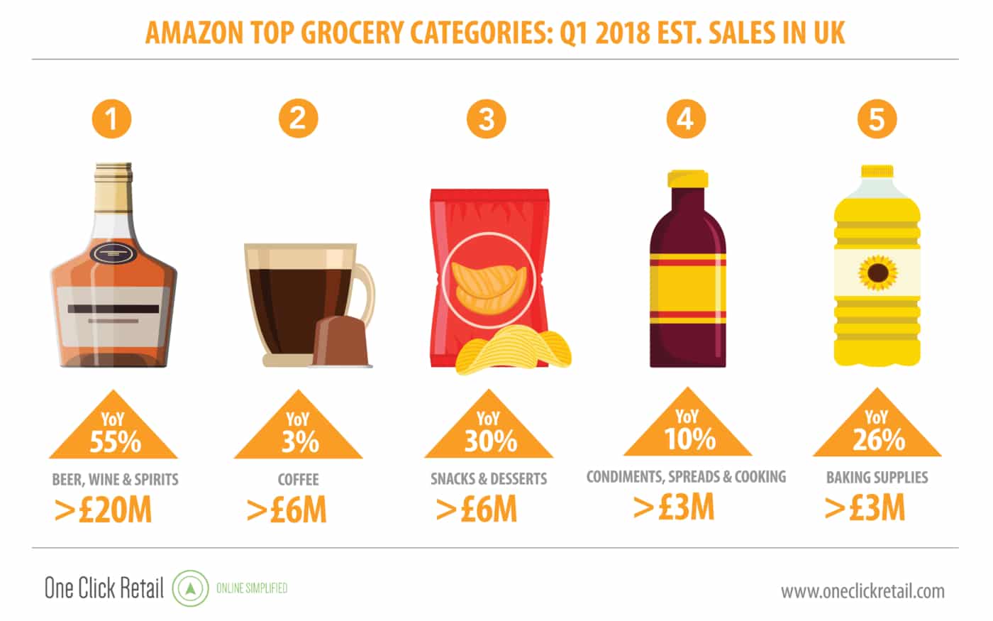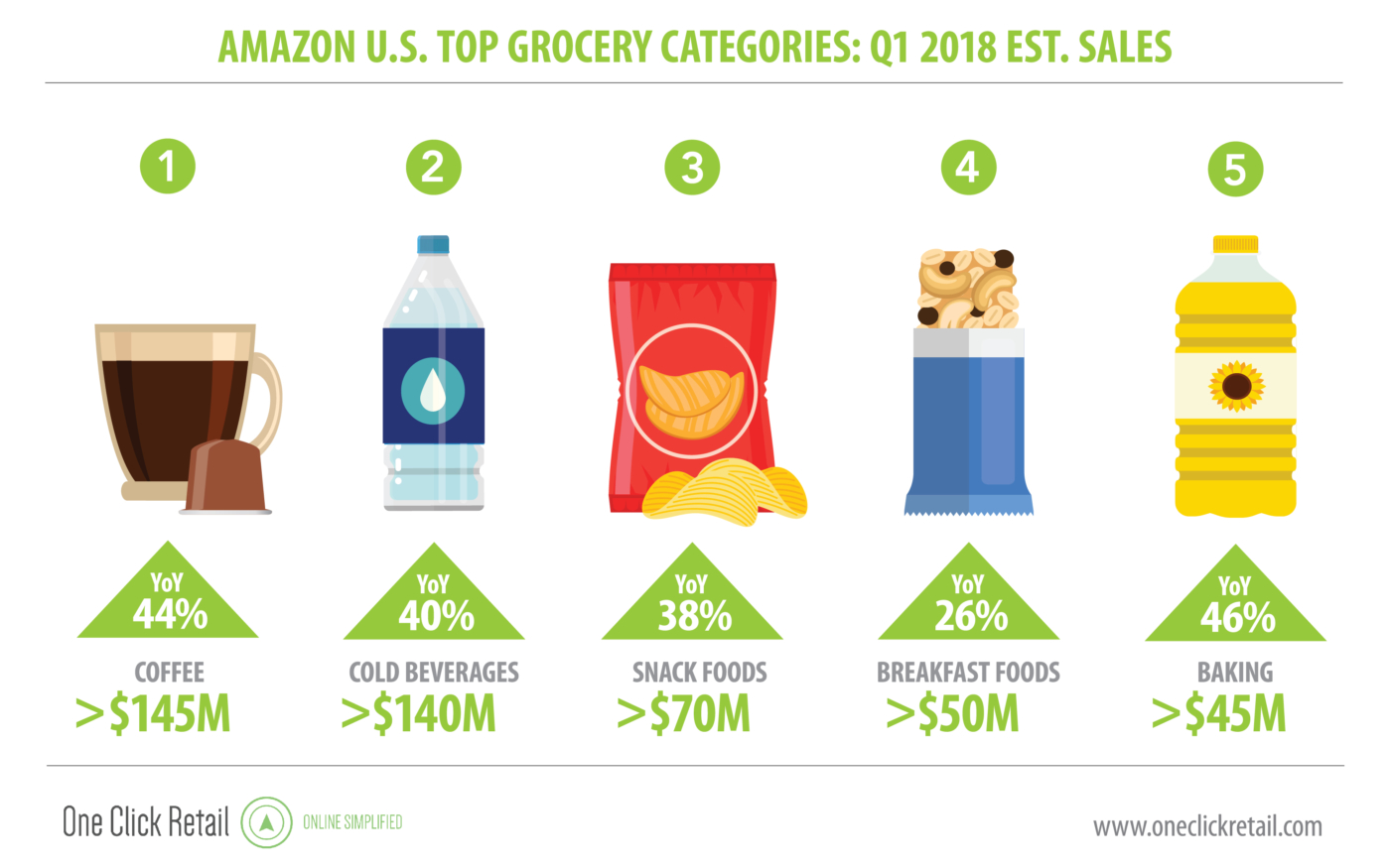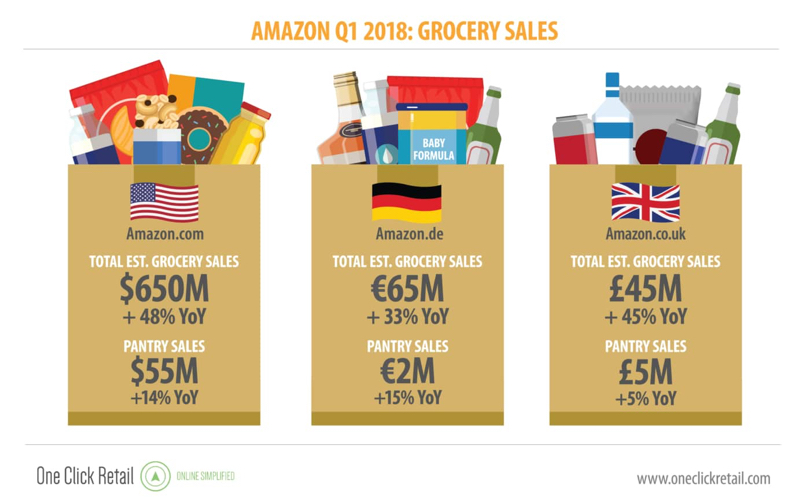 Quasi il 50% di crescita con un incremento di quasi 200 milioni di dollari. Sono le stime delle vendite di prodotti alimentari su Amazon negli Stati Uniti nel primo trimestre di quest'anno secondo le analisi di One Click Retail, una delle fonti più autorevoli al mondo quando si parla di eCommerce.