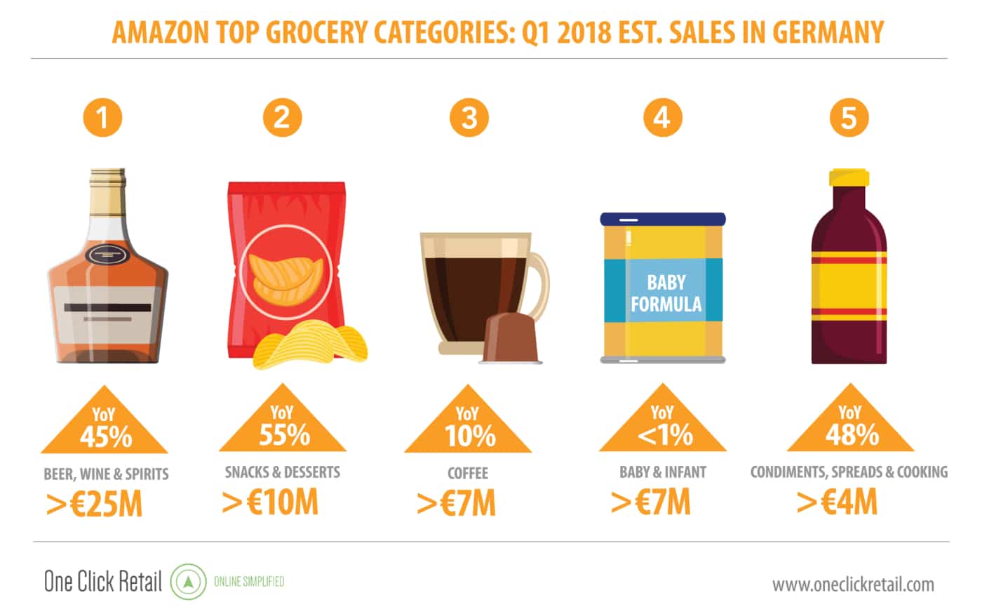 La Germania, invece, per Amazon è il mercato più importante in Europa sul fronte dei volumi movimentati nonché quello dove probabilmente sta più investendo con o servizio Amazon Fresh, presente ad Amburgo, Monaco di Baviera e Berlino. Anche qui la categoria più importante è quella delle bevande alcoliche che da sola rappresenta il 40% delle vendite complessive, mentre a crescere è la categoria degli snack & dessert, mentre si sono fermate le vendite dei prodotti per l'infanzia, nel 2016 i prodotti più venduti in Germania.