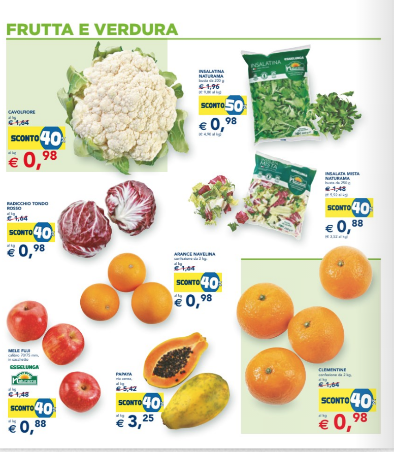 E' invece di taglio tecnologico il volantino che Esselunga ha messo appositamente a punto per il Black friday: dal televisore allo smartphone, passando per accessori ed elettrodomestici, gli affari che si potranno fare nel periodo che va dal 18 al 27 novembre riguardano altri reparti, non quello ortofrutticolo. E' pur vero, però, che fino al prossimo sabato è valida la promozione “Una spesa a meno di 15 euro” e che fino al 24 novembre alcuni prodotti ortofrutticoli sono scontati fino al 40 per cento. E' il caso del cavolfiore, delle clementine, della papaya, delle mele Fuji, del radicchio tondo rosso e di alcune insalate in busta.