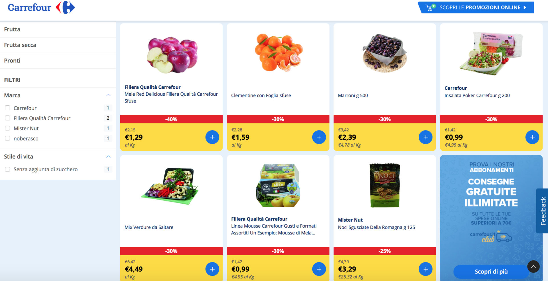 Nei punti di vendita di Carrefour, dal 17 al 29 novembre, è in atto la promozione black prices in tutti i reparti, ortofrutta incluso. A Milano, per esempio, si possono acquistare mele Red Delicious a 1,29 euro al chilo, il che significa il 40% in meno del prezzo originario. Sono invece scontati al 30% le clementine, i marroni, le insalate poker e il mix di verdure pronto per essere cucinato. Scontate del 25% anche le noci sgusciate.