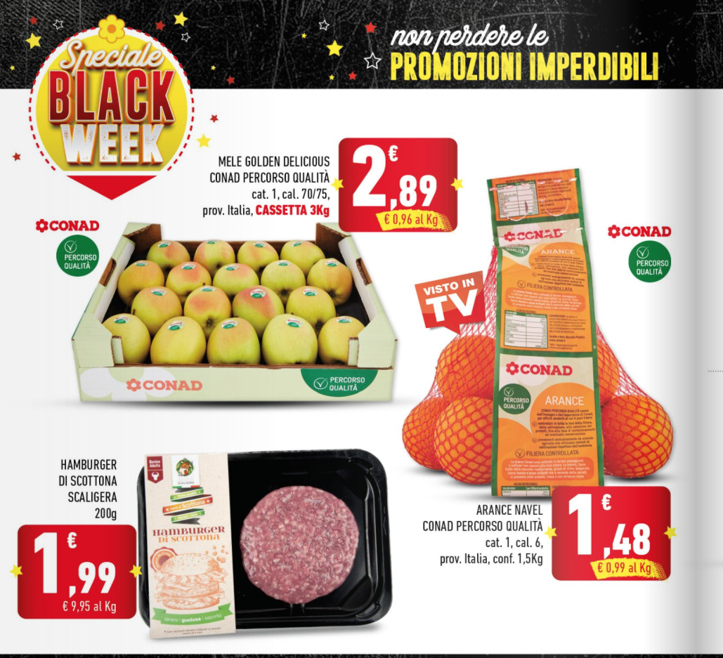 Ortofrutta in Black friday anche da Famila, dove un chilo e mezzo di mele Golden è in vendita a 1,39, dunque scontate di circa il 30%, mentre una rete di castagne da 750 grammi costa 2,49, il che significa il 35% rispetto al prezzo pre Black friday. Non è finita: nei punti di vendita di Conad di Palermo, per esempio, questa settimana la frutta invernale è in vendita a meno di un euro al chilo: una cassetta da tre chili di mele Golden non arriva a 3 euro, un chilo e mezzo di arance Navel costa 1,48.