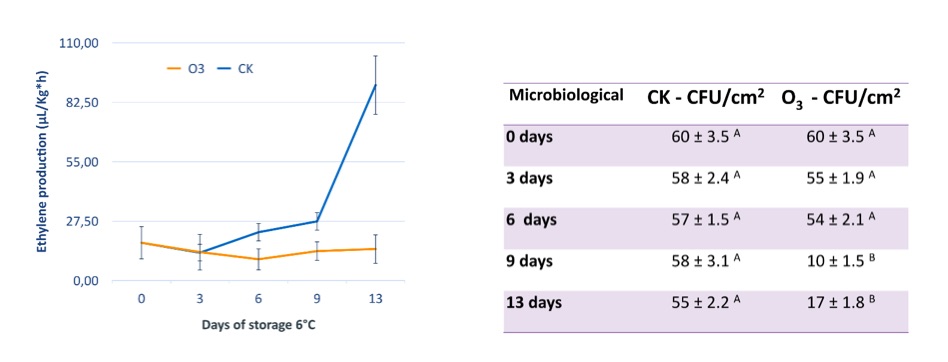 Rispetto ad altre tipologie di prodotti (fragole, lamponi, mirtilli, ecc… dove l’ozono è già ampiamente utilizzato), in cui il principale beneficio è dato dall’inibizione dello sviluppo delle muffe e della carica batterica, nei meloni l’ozono controllo anche la maturazione mediante l’abbattimento dell’etilene prolungando, anche a basse concentrazioni, la conservabilità mantenendo i parametri qualitativi del prodotto inalterati.