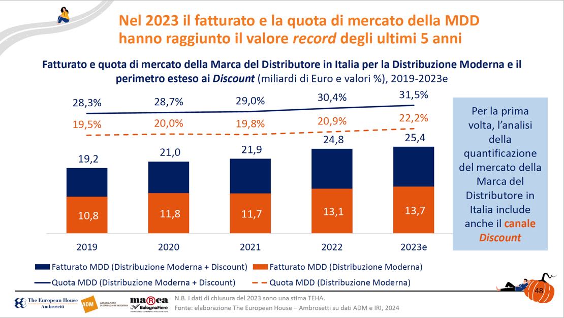 Nel 2023 si stima che la quota di mercato abbia raggiunto il 31,5%, con un fatturato complessivo di 25,4 miliardi. Numeri certamente importanti e che, per la prima volta, prendono in considerazione anche i prodotti a marchio presenti nei discount. Una novità che, secondo Valerio De Molli, managing partner e Ceo di The European Ambrosetti, è stata possibile grazie alla fattiva collaborazione proprio da parte dei discount in questa annuale analisi e che da tempo, sia analisti del settore che stampa specializzata, chiedevano a gran voce di prendere in considerazione.